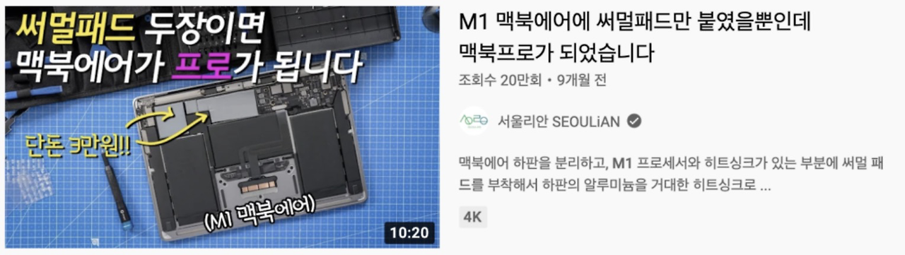 서울리안 : M1 맥북에어에 써멀패드만 붙였을뿐인데 맥북프로가 되었습니다